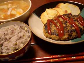 ミンチ肉を通常の半分に抑えて、かわりにコンニャクとキャベツを入れました。